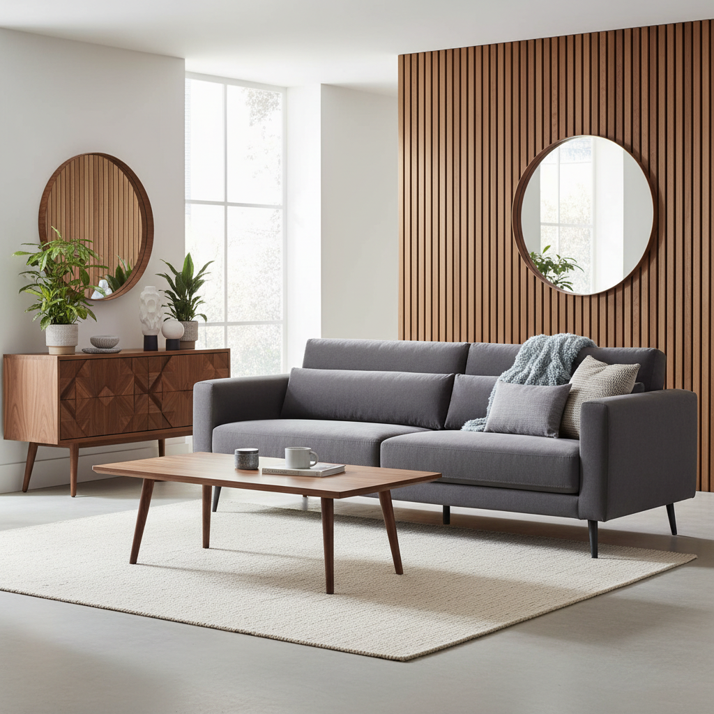 Give your living room a timeless mid-century modern appeal. A streamlined grey sofa with tapered legs works perfectly alongside walnut wood furniture, atomic-era inspired lighting, and abstract art. Introduce pops of orange or olive green for an authentic, retro-chic vibe.