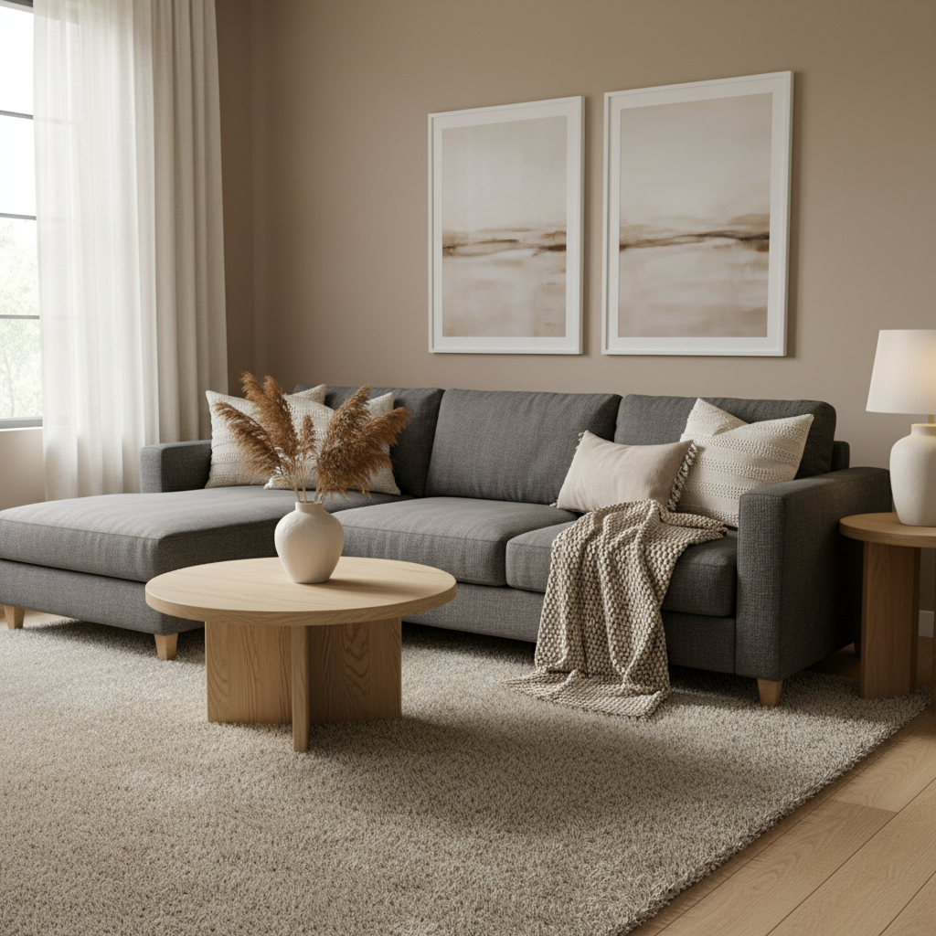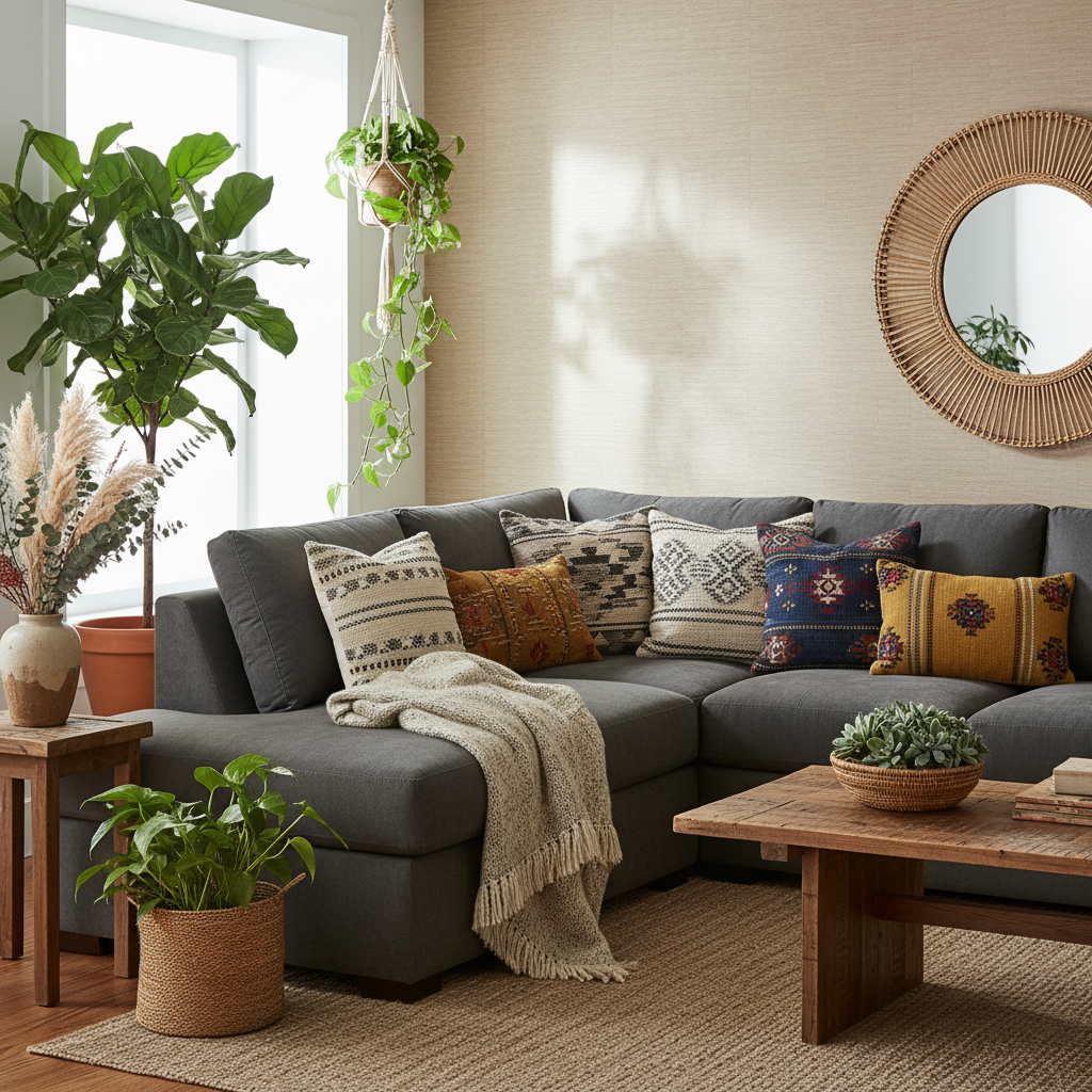Connect with nature by pairing your grey sofa with a palette of earthy tones—terracotta, olive green, and sandy browns. Incorporate abundant natural textures like raw wood, linen, and woven rugs. This creates a grounded, organic, and deeply comforting living space.