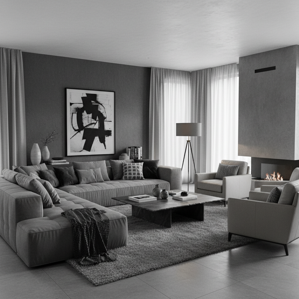 Embrace the full spectrum of grey by layering different tones. Think charcoal walls, a light grey sofa, and silver-grey accessories. Introduce subtle textures through wool throws, velvet cushions, and a concrete coffee table to prevent the scheme from feeling flat. The mood is refined, calm, and incredibly chic.