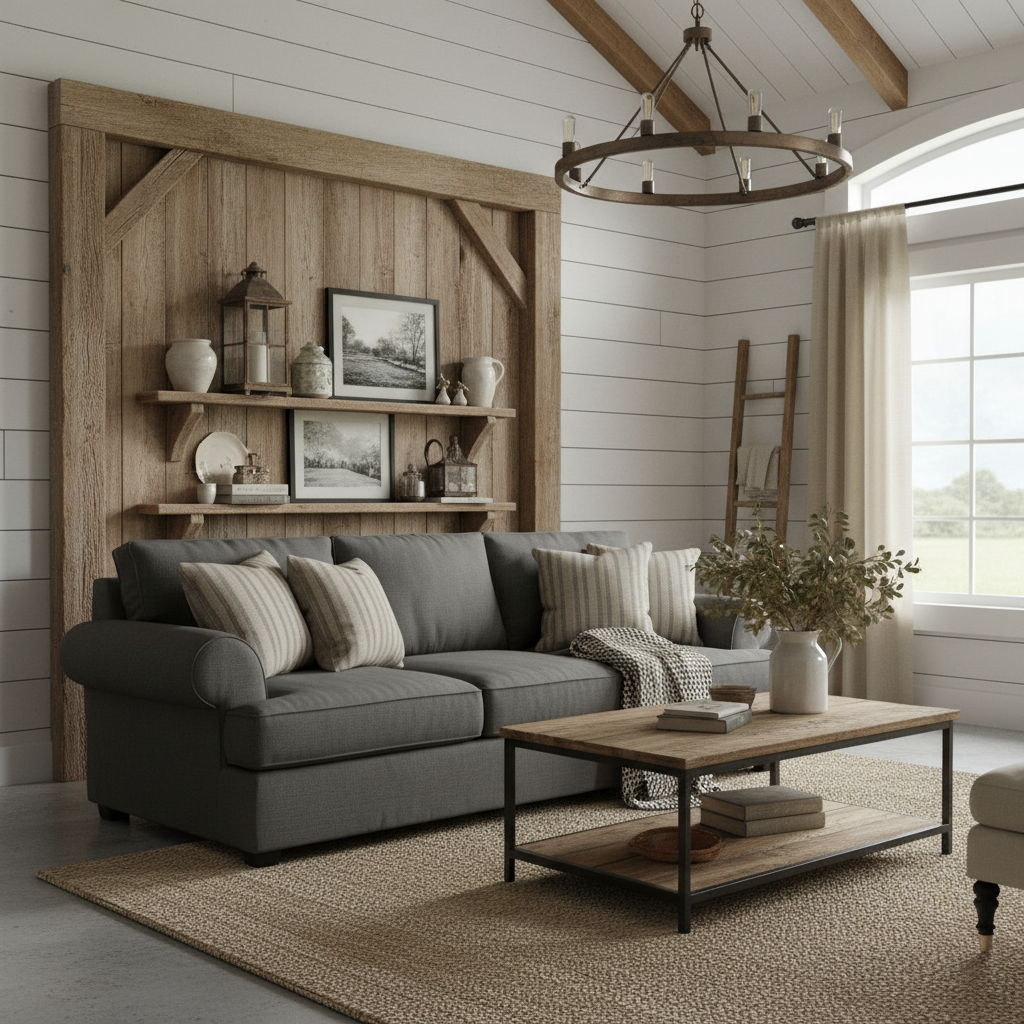 Blend rustic warmth with contemporary comfort. Your grey sofa anchors a modern farmhouse look, complemented by shiplap walls, reclaimed wood furniture, and cozy knit textures. Introduce galvanized metal accents and simple, elegant lighting for a welcoming, homey feel.