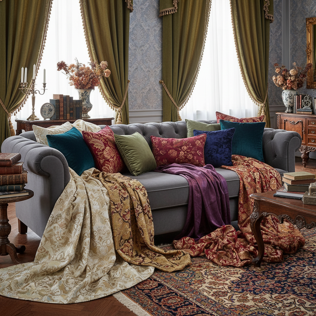 Indulge in tactile luxury by pairing your grey sofa with sumptuous fabrics. Velvet cushions, a faux fur throw, or silk curtains instantly elevate the space. These rich textures add depth, warmth, and a decadent feel, transforming your living room into a lavish retreat.