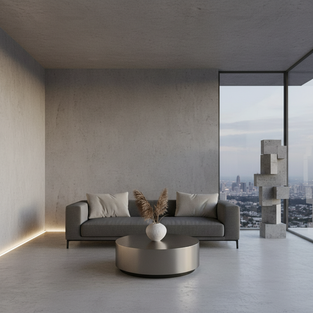 A celebration of clean lines and understated luxury, this design uses a neutral palette of charcoal grays, crisp whites, and muted earth tones. Concrete, brushed steel, and light wood are key materials, offering texture without visual clutter. Furniture is streamlined and low-profile, emphasizing form and function. The atmosphere is calm, uncluttered, and effortlessly chic, promoting focus and relaxation in a serene environment.