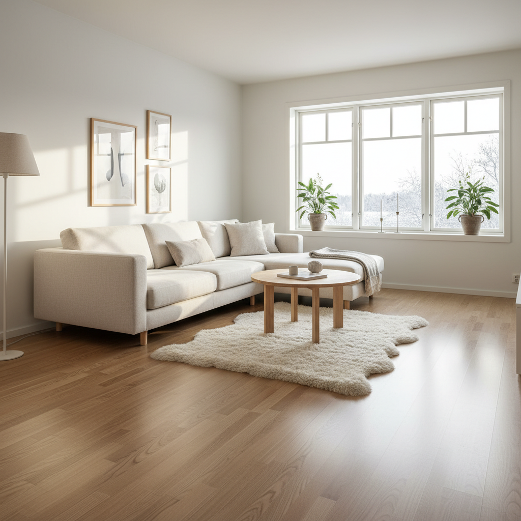 Celebrate functionality and understated beauty. A clean palette of whites, light grays, and natural wood tones, with subtle black accents. Materials include light ash wood, wool, cotton, and ceramic. Furniture is minimalist, highly functional, and emphasizes clean lines. The mood is serene, bright, and inviting, promoting a sense of calm and well-being.
