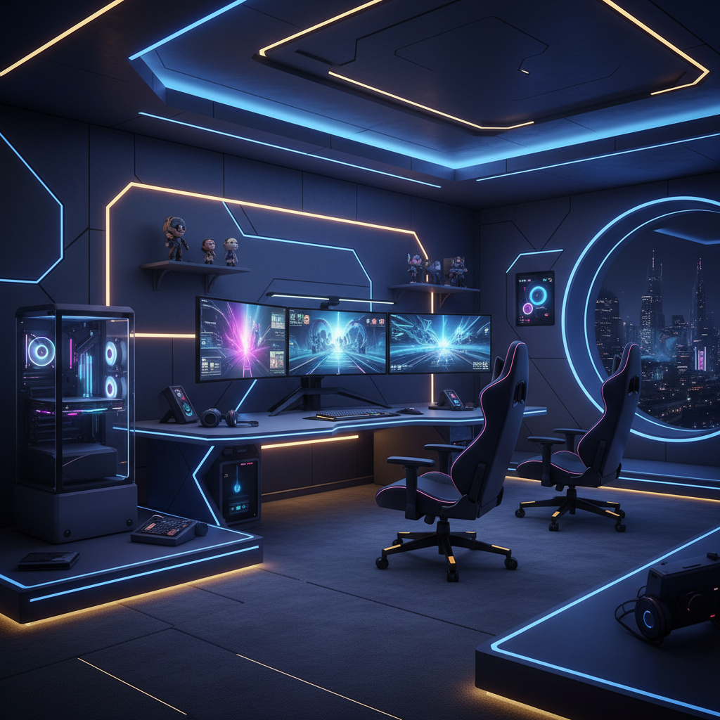 Where cutting-edge technology meets sleek design. A dark, moody palette of black, deep blues, and purples is often illuminated by customizable LED lighting. Materials include smooth composites, brushed aluminum, and high-tech fabrics. Ergonomic gaming chairs, multi-screen setups, and integrated sound systems are key. The atmosphere is immersive and dynamic, designed for peak performance and ultimate entertainment.