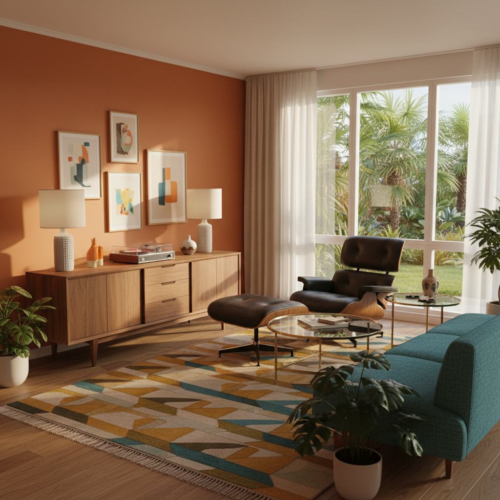Embrace the iconic style of the 1950s and 60s. A palette of warm woods, olive greens, mustard yellows, and teals. Materials include walnut wood, tweed, and leather, often with slender, tapered legs. Furniture features organic shapes, clean lines, and timeless designs like an Eames lounge chair. The mood is sophisticated, playful, and eternally stylish.