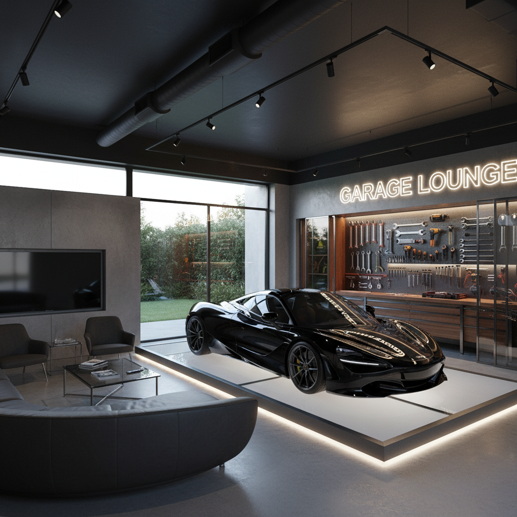 This space elegantly merges a passion for cars with sophisticated living. A masculine palette of charcoal, black, and silver, perhaps with a subtle accent color from a favorite car marque. Polished concrete, diamond plate, and sleek metal cabinetry are key. Comfortable seating, a dedicated display for a prized vehicle, and subtle automotive art create the ambiance. The mood is dynamic, precise, and undeniably cool.