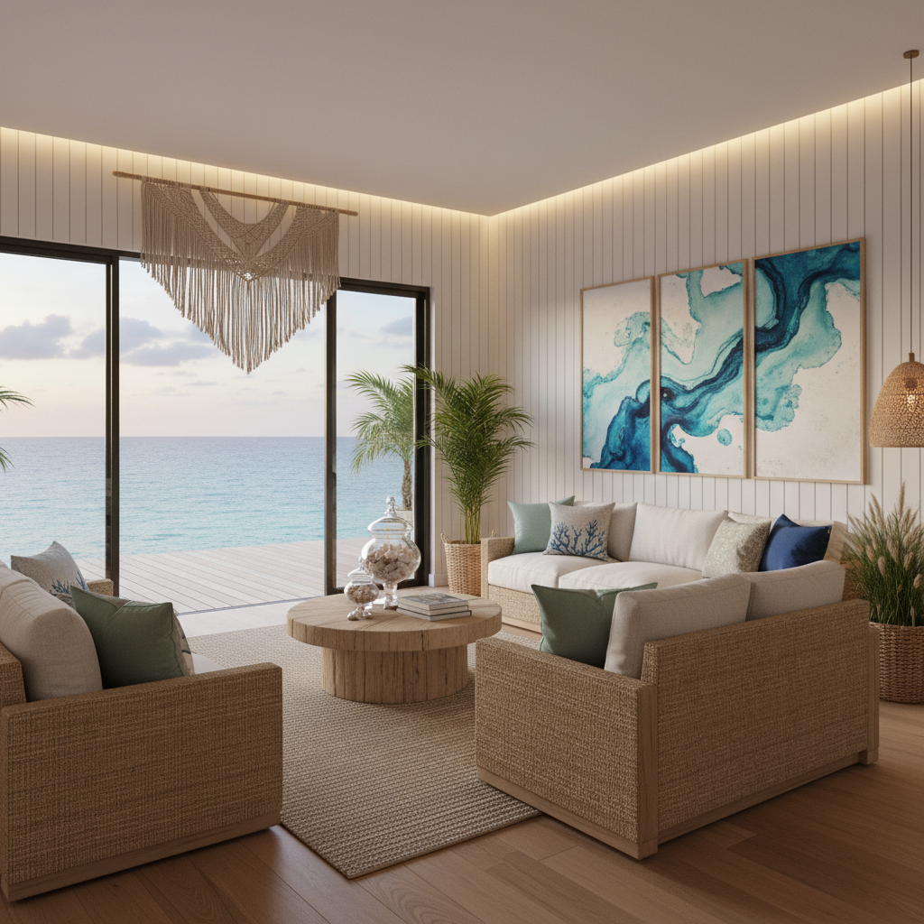 Bring the tranquility of the seaside indoors with a soothing palette of soft blues, sandy beiges, and crisp whites. Driftwood, linen, and woven natural fibers like jute or seagrass create texture. Comfortable, oversized sofas and light wood furniture evoke a relaxed beach house vibe. The mood is airy, refreshing, and peaceful, a perfect escape from daily stresses.