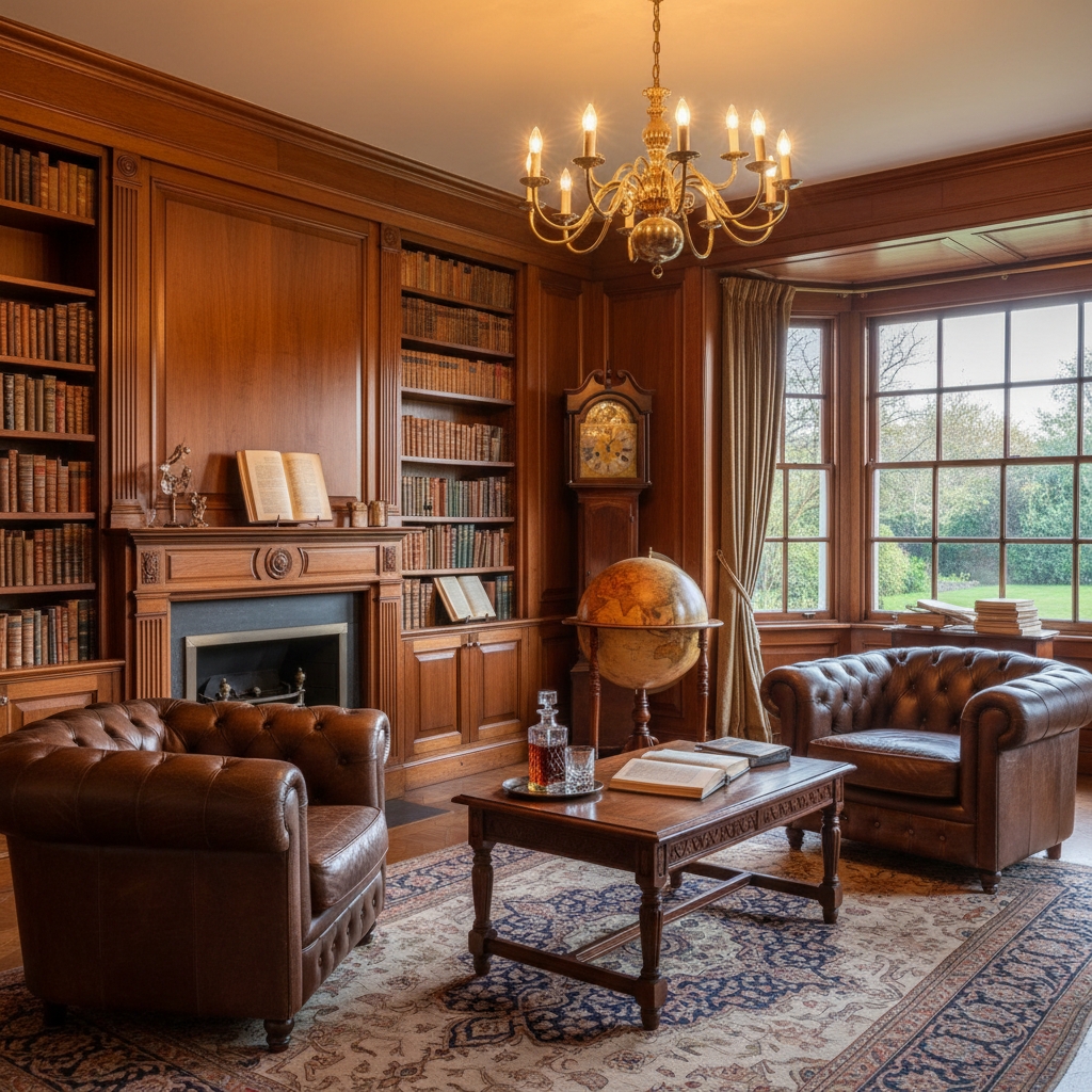 This design evokes timeless elegance with its deep, rich color palette. Think dark forest greens, burgundy, and navy blues, accented by warm gold and brass tones. Materials like polished mahogany, deep tufted leather, and heavy wool fabrics create a sense of enduring luxury. Furniture features classic silhouettes—Chesterfield sofas, wingback chairs, and substantial wooden desks. The mood is one of quiet contemplation and dignified comfort, perfect for reading or enjoying a fine spirit.