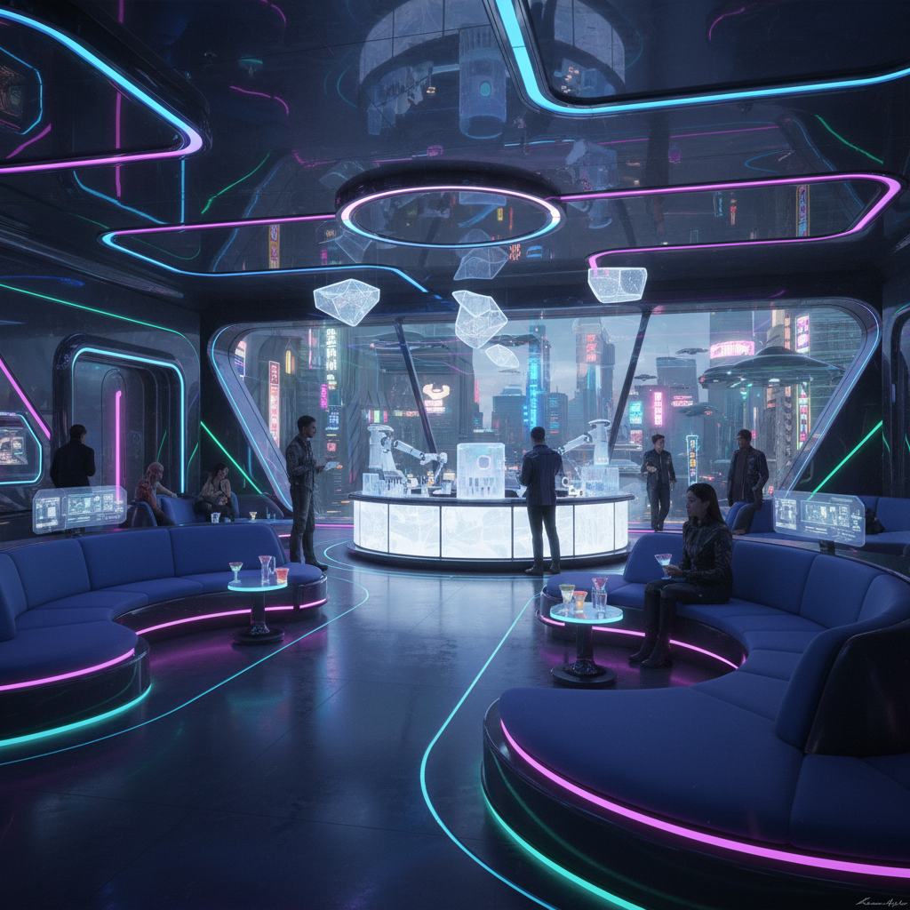 For the visionary, this design draws from futuristic aesthetics. A dark, cosmic palette of deep blues, purples, and blacks, illuminated by neon accents. Materials include polished metals, smooth composites, and integrated lighting. Furniture is sleek, often modular, and designed with ergonomic comfort in mind. The mood is immersive, imaginative, and endlessly intriguing.