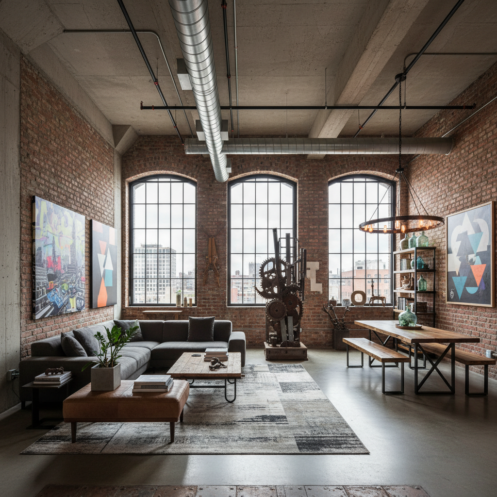Embrace raw beauty with exposed brick, concrete floors, and visible ductwork. The color scheme leans into grays, blacks, and deep browns, punctuated by metallic accents in copper or iron. Reclaimed wood, distressed leather, and metal furniture with robust silhouettes define the space. The mood is edgy yet inviting, a perfect blend of urban grit and sophisticated comfort, ideal for creative minds.