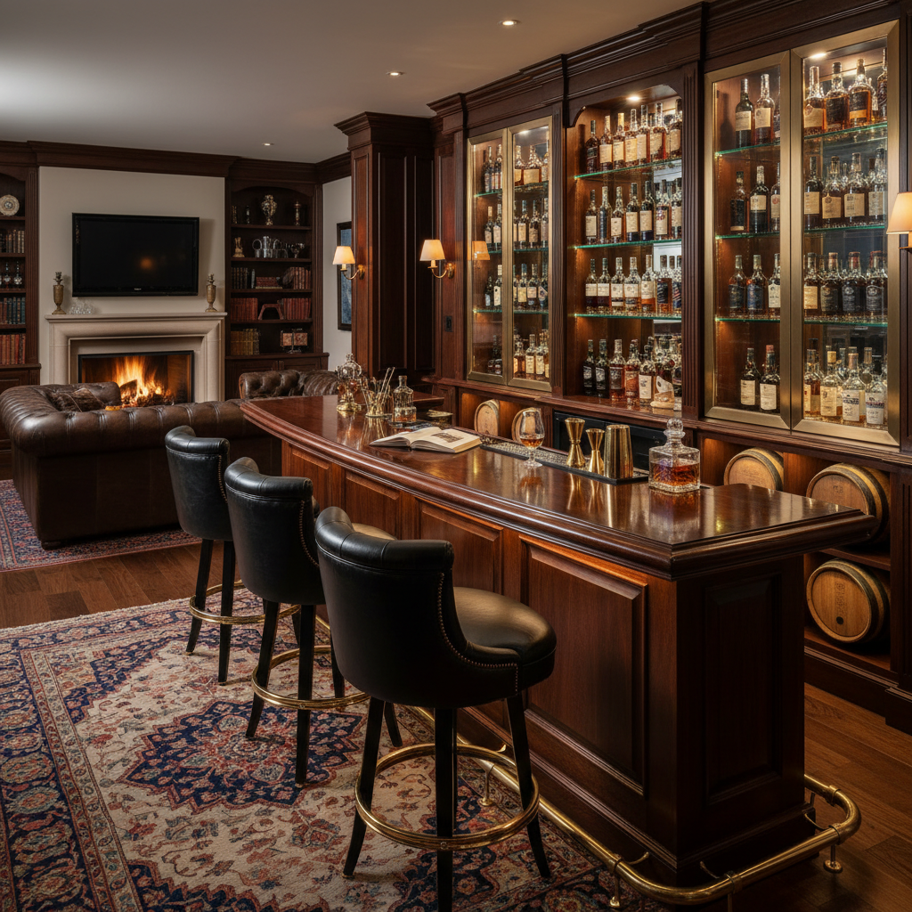 This design centers around the art of fine spirits. A palette of deep amber, burnt umber, and dark chocolate hues creates a warm, inviting glow. Polished dark wood, brass accents, and fine crystal glassware are essential. A well-appointed bar, comfortable leather stools, and display cabinets for cherished bottles define the space. The mood is convivial, refined, and perfect for intimate conversations.