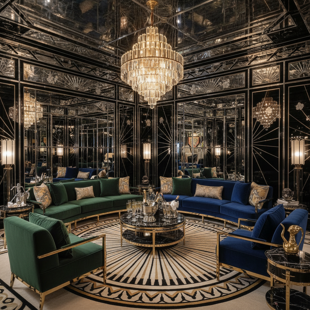 Step back in time to the roaring twenties with a design that exudes glamour. A palette of black, gold, silver, and deep jewel tones like emerald green or sapphire blue. Materials include polished chrome, mirrored surfaces, high-gloss lacquers, and sumptuous velvet. Furniture features geometric shapes, intricate detailing, and luxurious upholstery. The mood is opulent, sophisticated, and undeniably stylish.