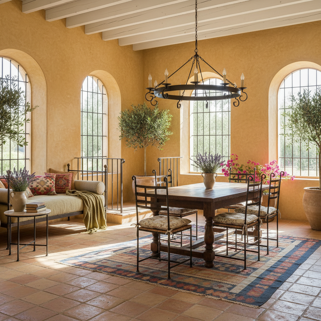 Transport yourself to the sunny shores of the Mediterranean. A palette of warm terracotta, deep blues, olive greens, and sun-drenched whites. Materials like stucco, wrought iron, and rustic wood are prominent. Furniture is often robust, comfortable, and features handcrafted details. The mood is relaxed, earthy, and inviting, perfect for long, lazy afternoons.