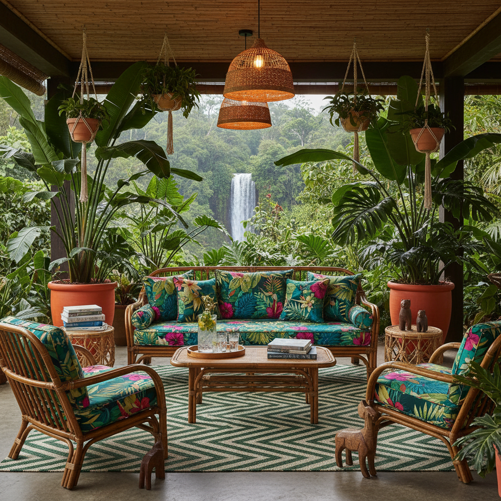 Escape to a verdant paradise within your home. A vibrant palette of emerald greens, deep blues, and sunny yellows, accented by natural wood tones. Materials include rattan, bamboo, natural linen, and lush living plants. Comfortable, low-slung furniture and exotic patterns create a relaxed yet sophisticated resort feel. The mood is refreshing, exotic, and wonderfully serene.