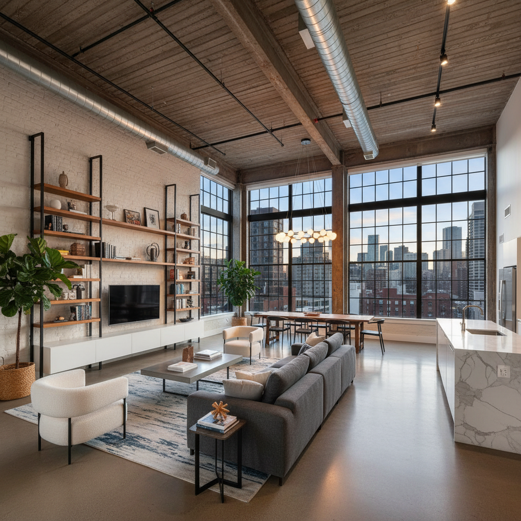 This design celebrates industrial architecture with a modern twist. A cool, sophisticated palette of grays, blacks, and whites, with pops of vibrant color. Exposed brick, large windows, and polished concrete floors are characteristic. Furniture is contemporary, often modular, and made from metal and leather. The mood is sleek, dynamic, and effortlessly cool, ideal for city living.