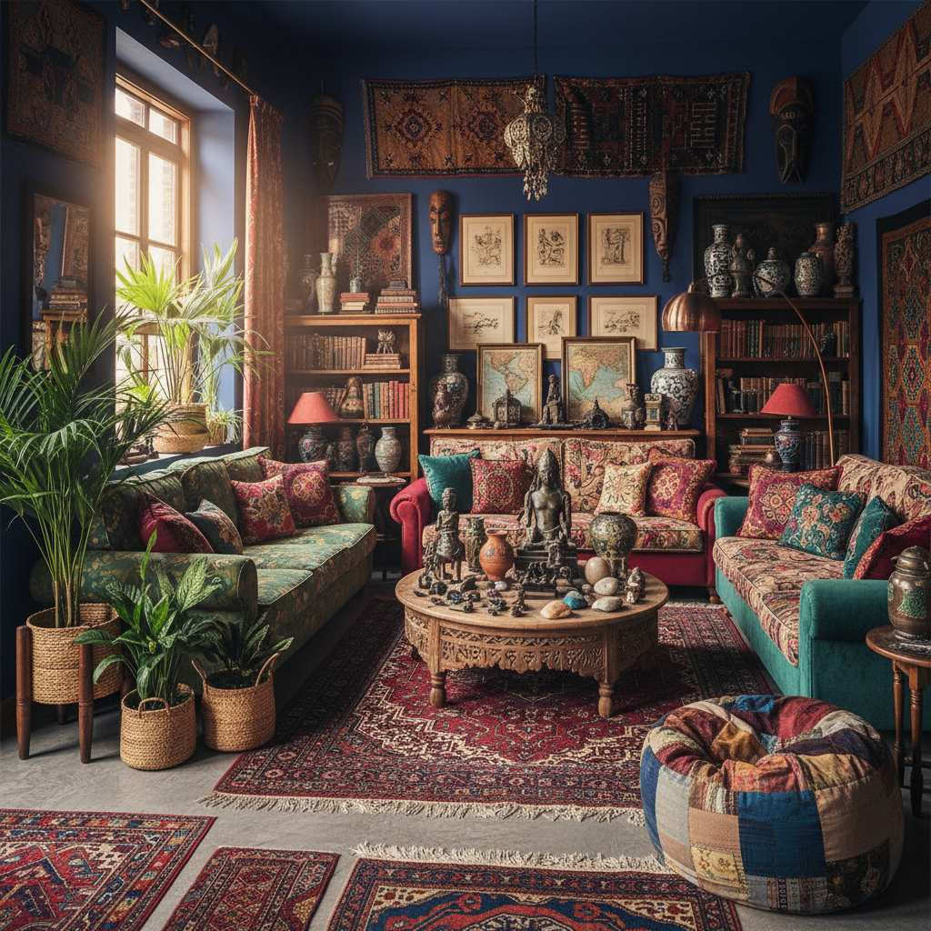 For the free spirit, this design blends comfort with global influences. A rich, earthy palette of terracotta, olive green, mustard yellow, and deep indigo. Natural fibers like rattan, macrame, and woven textiles are prominent. Low-slung furniture, floor cushions, and an array of patterned rugs create an inviting space. The mood is relaxed, artistic, and wonderfully eclectic, encouraging creative thought.
