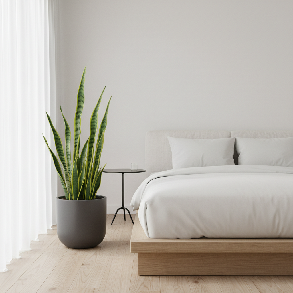 Adding a touch of nature can instantly bring life and freshness to a minimalist bedroom. Select one or two simple, elegant plants like a snake plant, ZZ plant, or a small fiddle-leaf fig. Place them in understated pots made from natural materials like terracotta or ceramic. Greenery introduces organic texture and a calming natural element.