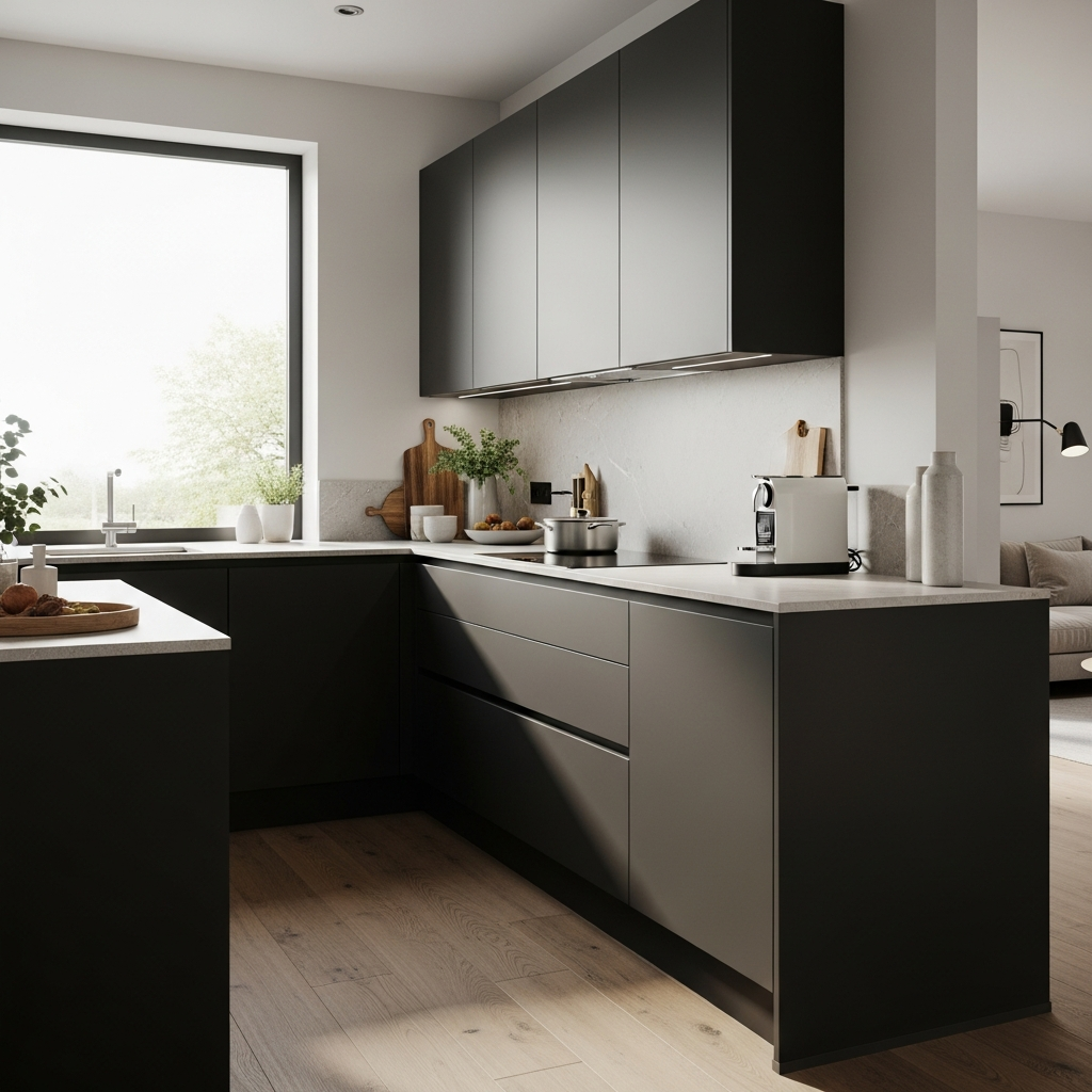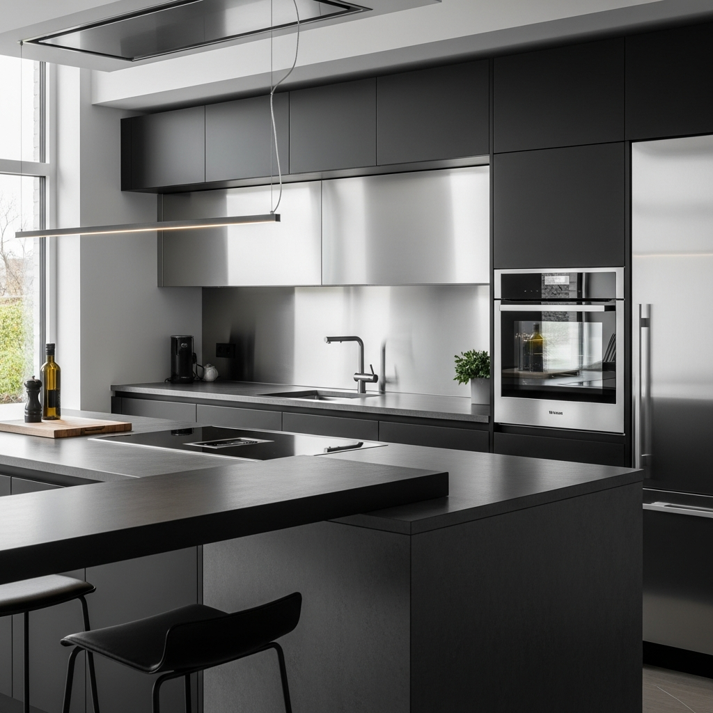 The color palette often leans into sophisticated neutrals like deep charcoal or a rich espresso, contrasted with a lighter countertop. Materials might include polished concrete, large format porcelain, or even fluted wood panels, offering both visual weight and intriguing texture. The overall mood is one of grounded elegance and strong architectural presence.