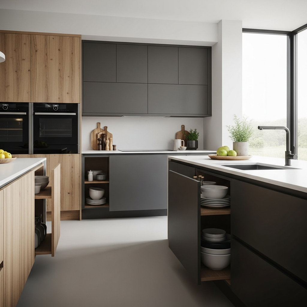 Often seen in minimalist white, gray, or dark matte finishes, these cabinets rely on the quality of their material and precise alignment. The subtle shadow gaps between doors or push-to-open mechanisms maintain a clean look. The mood is incredibly refined, seamless, and sophisticated.