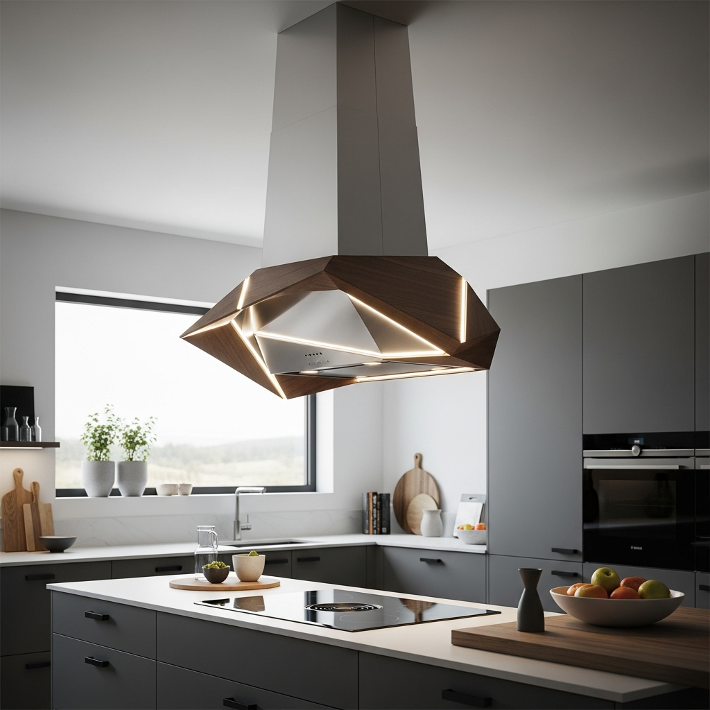 These often come in striking materials like brushed steel, matte black, or even custom wood enclosures that match cabinetry. The surrounding kitchen might be minimalist to let the hood stand out. The mood is bold, professional, and makes a strong design statement.