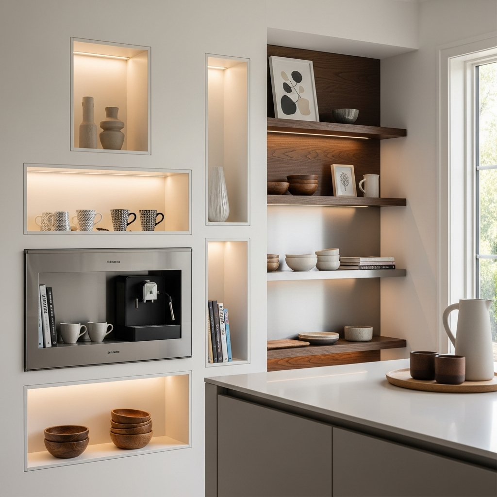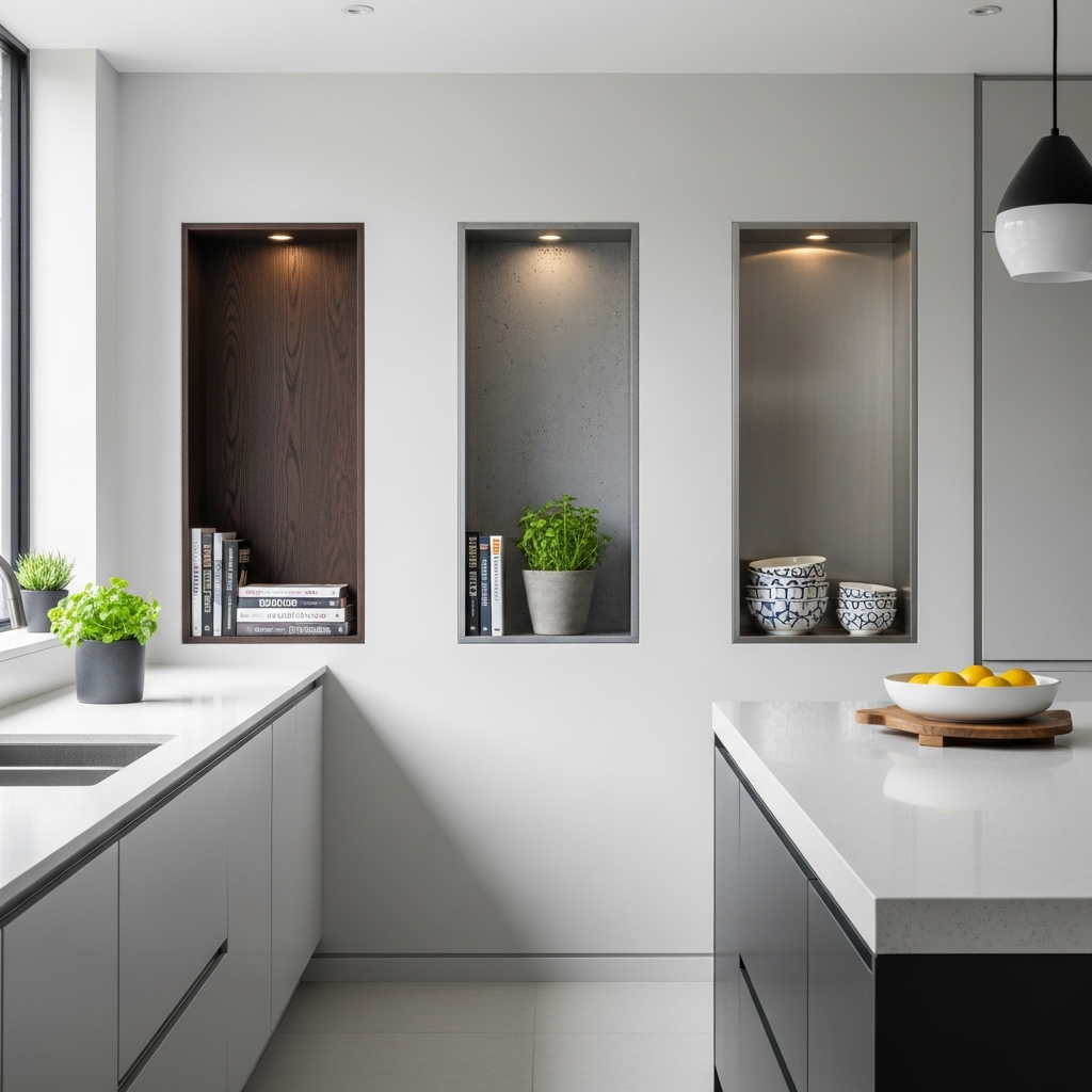 Beyond simple recessed shelving, consider deeper architectural niches that are distinctly finished with a contrasting material or color. These could house small appliances, decorative items, or simply add a visual break.