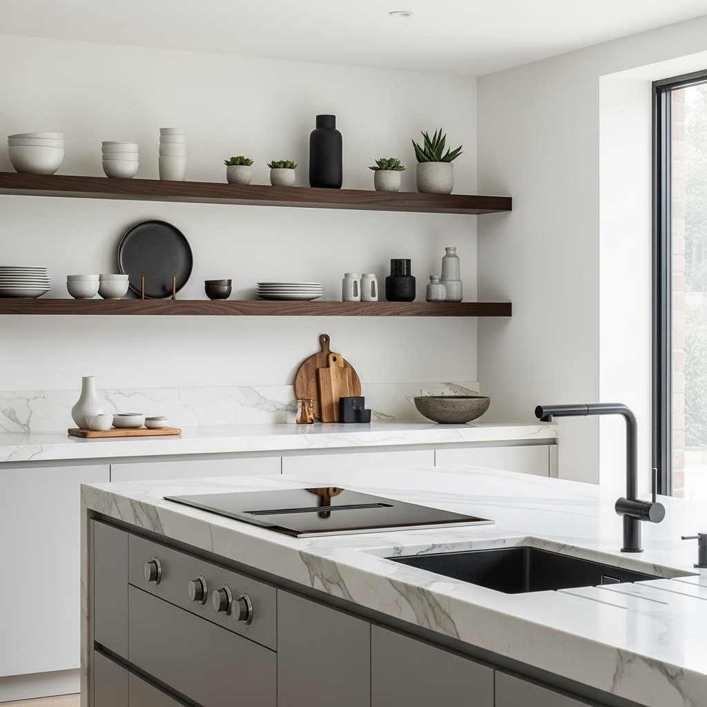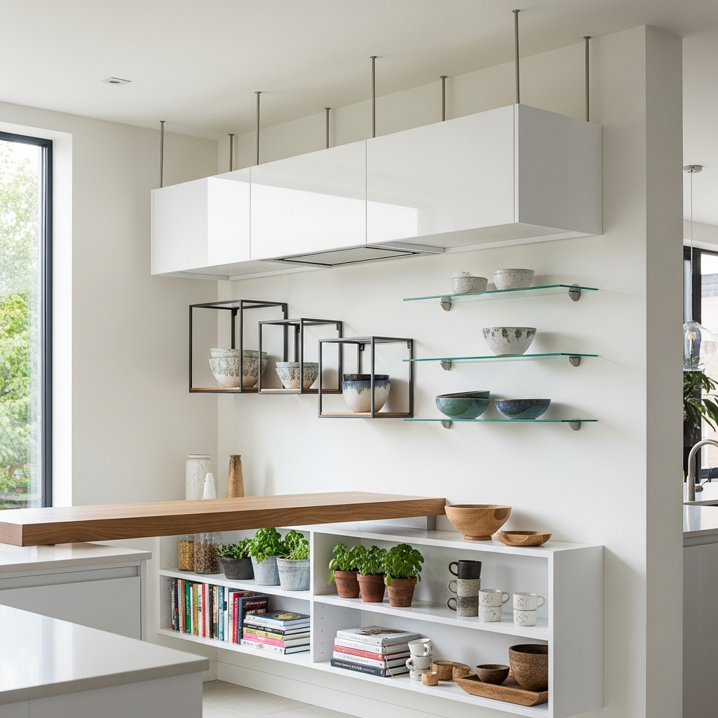 Open shelves, especially those appearing to float, instantly add a sense of airiness and three-dimensionality. They break up the solidity of closed cabinets and provide platforms for curated displays of kitchenware or decor.