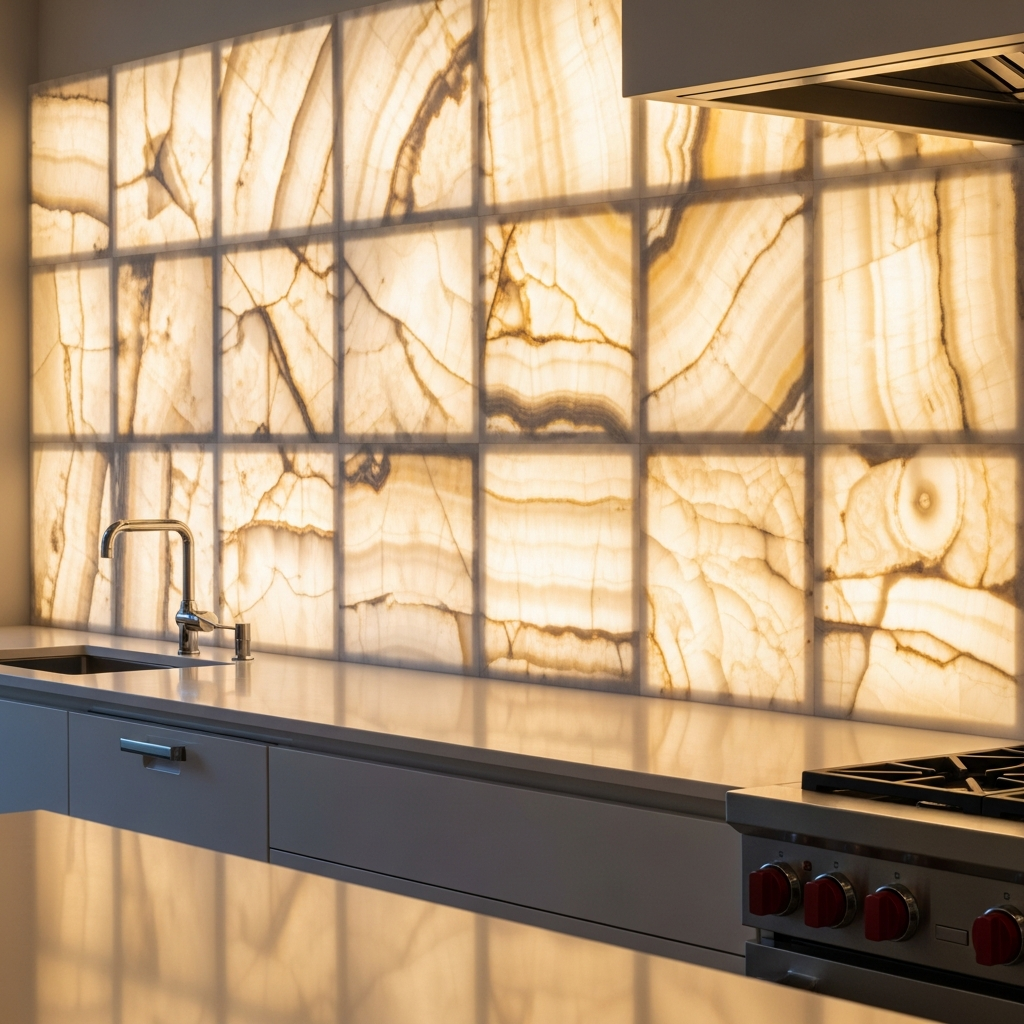 The color palette is dictated by the natural stone, often ranging from warm golden hues to cool grays and greens. The light itself becomes a soft, ambient glow. This creates a truly opulent, sophisticated, and captivating atmosphere, turning a surface into a luminous artwork.