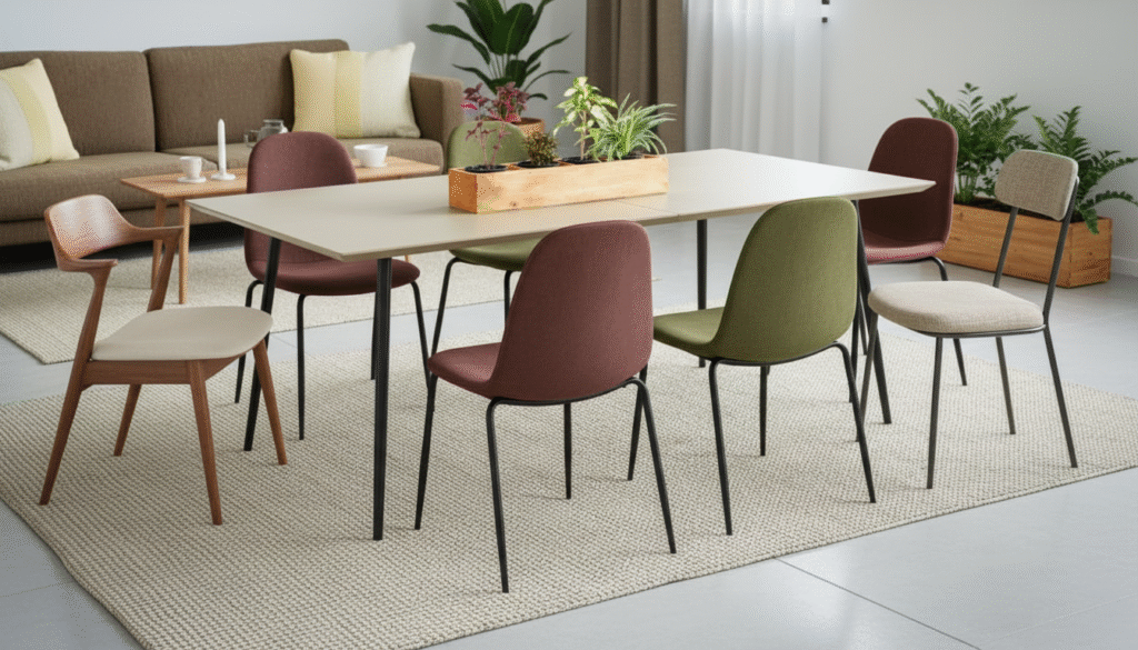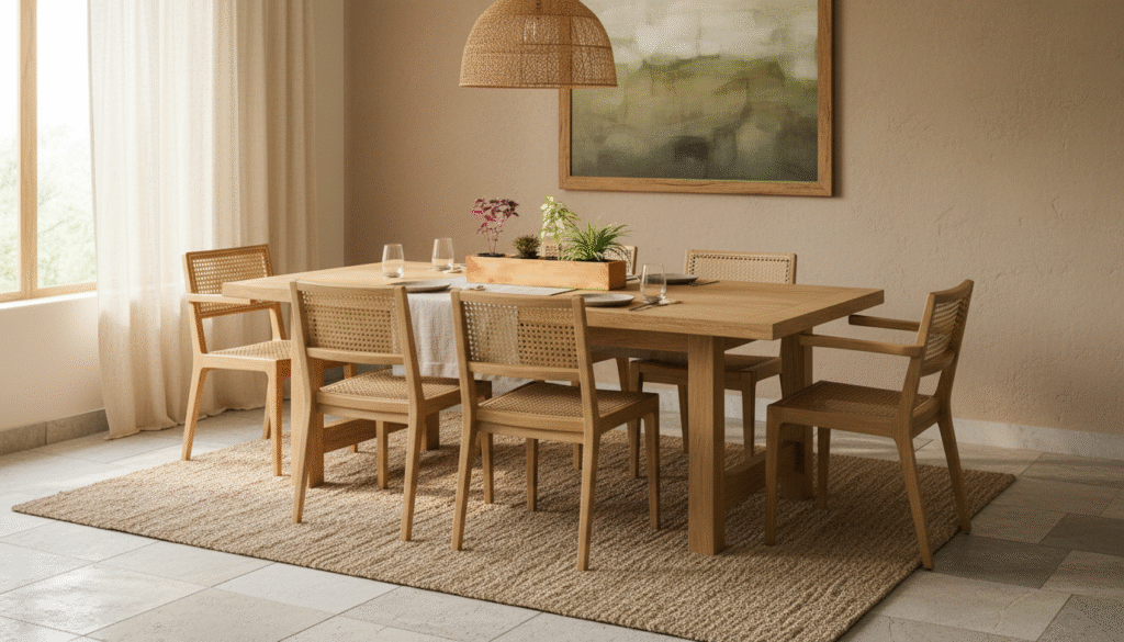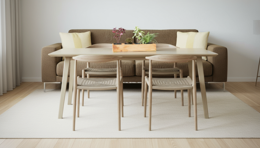 A rug adds warmth, helps with acoustics, and visually anchors your dining set — the perfect finishing touch for a modern setup.