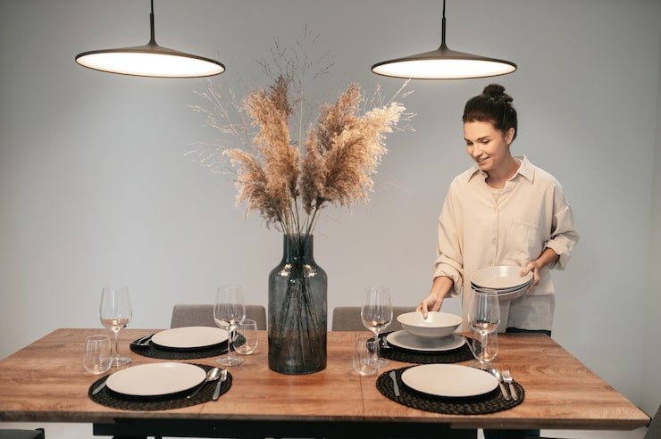 Keep your dining table mostly clear, use high-quality materials, and focus on balance. Every piece should serve a purpose — whether it’s functional, beautiful, or both.