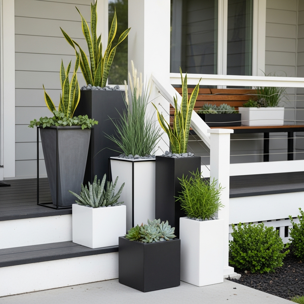 Modern design often embraces simplicity. Opt for planters with clean lines and geometric shapes, like cylinders, squares, or simple bowls. Materials like concrete, black metal, or unglazed terracotta fit perfectly. Instead of expensive, oversized pots, look for smaller, affordable options and group them in varying heights for visual interest. A monochromatic palette of grey, black, or white for the planters keeps the look cohesive and sophisticated. Fill them with low-maintenance, architectural plants like snake plants, succulents, or tall grasses.