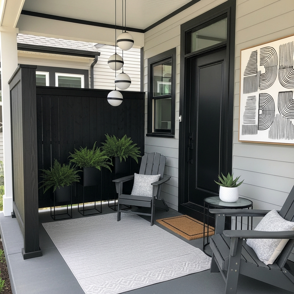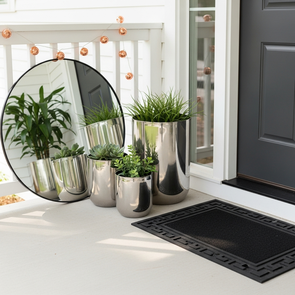 Introduce a touch of modern glamour with reflective elements. A small, round mirror framed in black or a shiny metallic can reflect light and greenery, making the porch feel larger and brighter. Alternatively, use planters with a metallic finish (silver, gold, or copper) or even a glossy black. These elements catch the eye and add a subtle sparkle, enhancing the contemporary feel without being over-the-top.