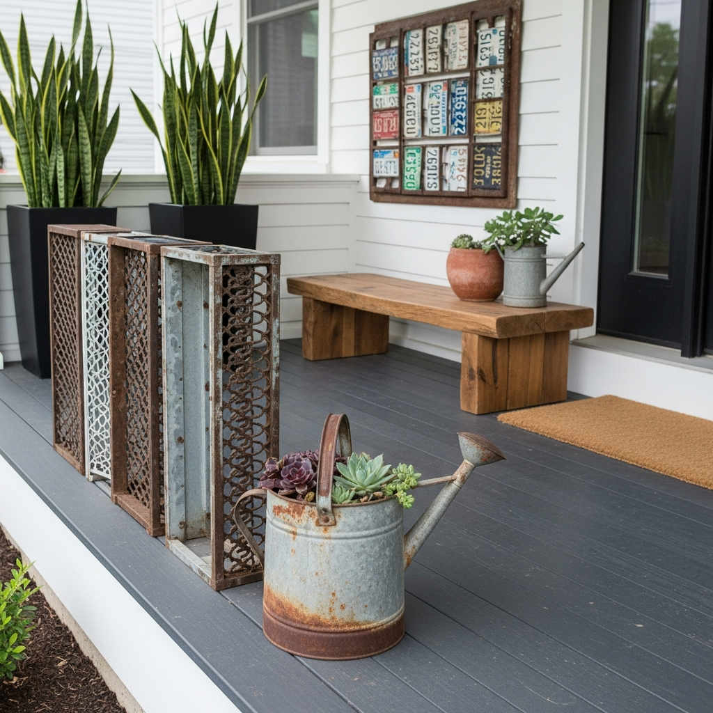 Metal accents can bring an industrial-modern edge to your porch. Look for old metal lanterns, buckets, or even small sculptures at flea markets. Clean them up and spray paint them in a matte black, bronze, or a bold metallic color. These pieces add texture and visual interest, perfectly complementing minimalist designs. The contrast of old forms with a new finish creates a unique modern statement.
