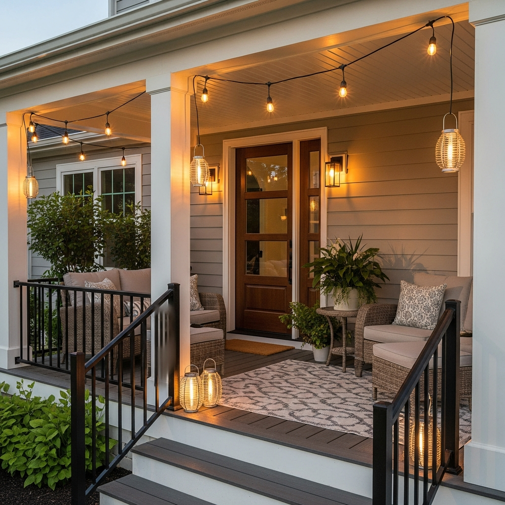 Modern design appreciates good lighting. String lights draped across the porch ceiling or railings add a cozy, inviting glow in the evenings. For a more structured look, consider modern-style solar lanterns placed on steps or hooks. Edison bulb strings offer a chic, industrial-modern vibe, while simple globe lights provide a soft, diffused light. Both are inexpensive ways to elevate the porch’s atmosphere after dark.