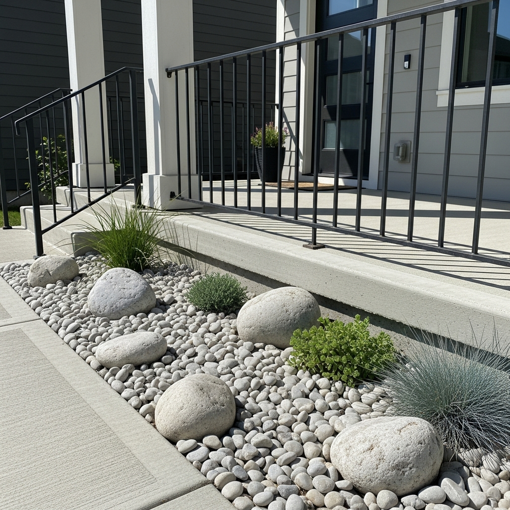 For a low-maintenance, modern landscaping touch around your porch, consider a small bed filled with decorative rocks or pebbles. Instead of traditional mulch or flower beds, this clean, minimalist approach offers texture and contrast. Arrange larger rocks strategically, or even add a small, drought-tolerant succulent. The natural textures and neutral colors are inherently modern and require little upkeep.