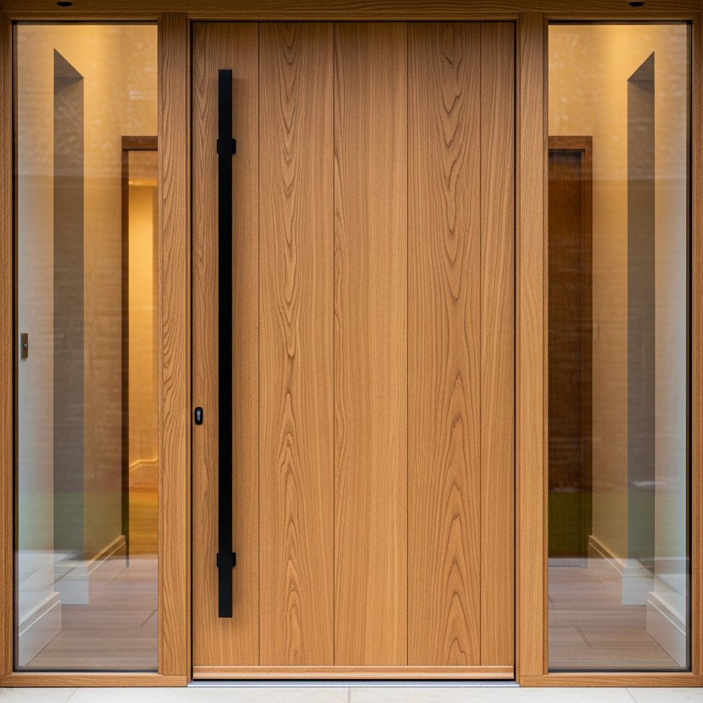 A modern front door often features oversized proportions or unique materials. Pivot doors are particularly popular for their wide clearance and high-end feel. Look for designs with vertical glass lites or natural wood finishes to create a focal point for the entire facade.