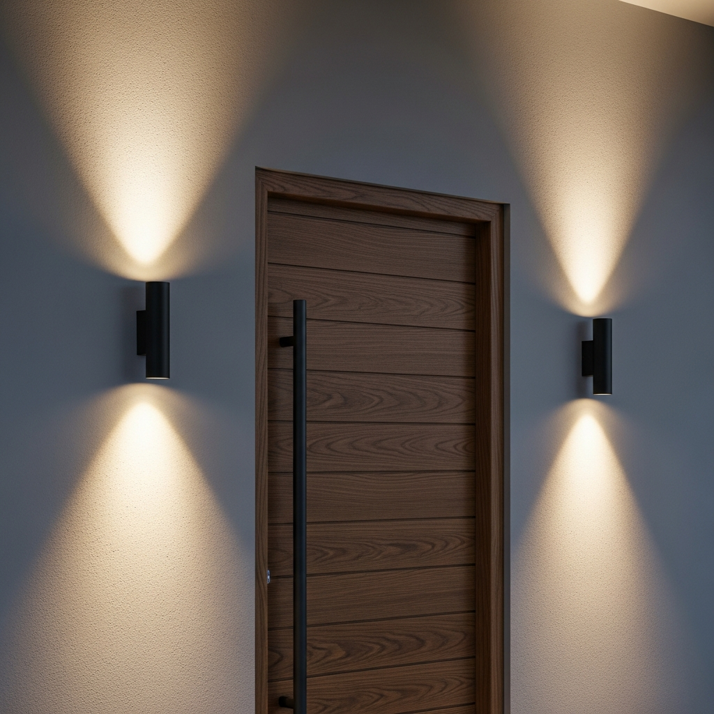 Lighting should be both functional and decorative. Modern industrial sconces with clean geometric shapes and metallic finishes like brushed nickel or black iron provide excellent illumination. Position them symmetrically around the door to create a balanced, professional appearance.