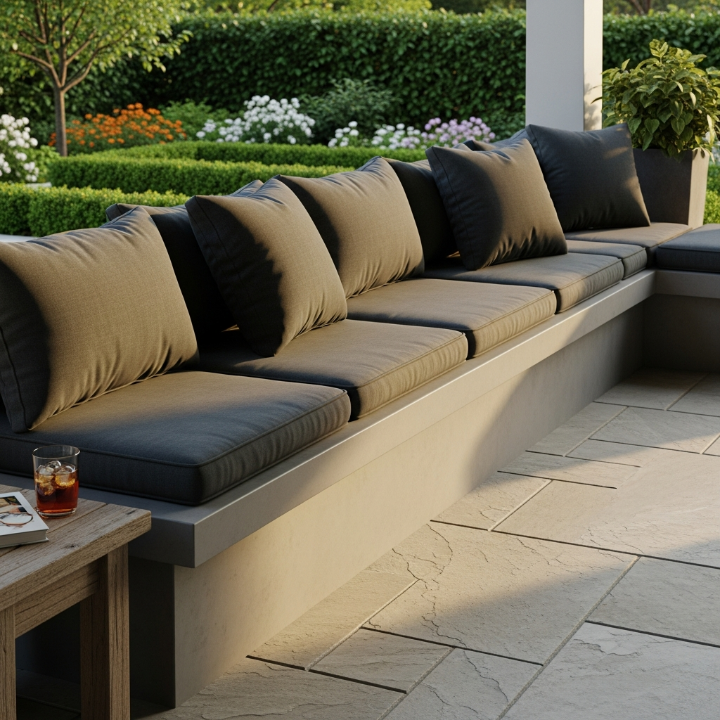 Incorporate permanent seating with a sleek concrete bench. Poured concrete offers a raw, industrial aesthetic that is incredibly durable. To make it more comfortable and inviting, add weather-resistant cushions in a neutral tone like charcoal or slate grey.