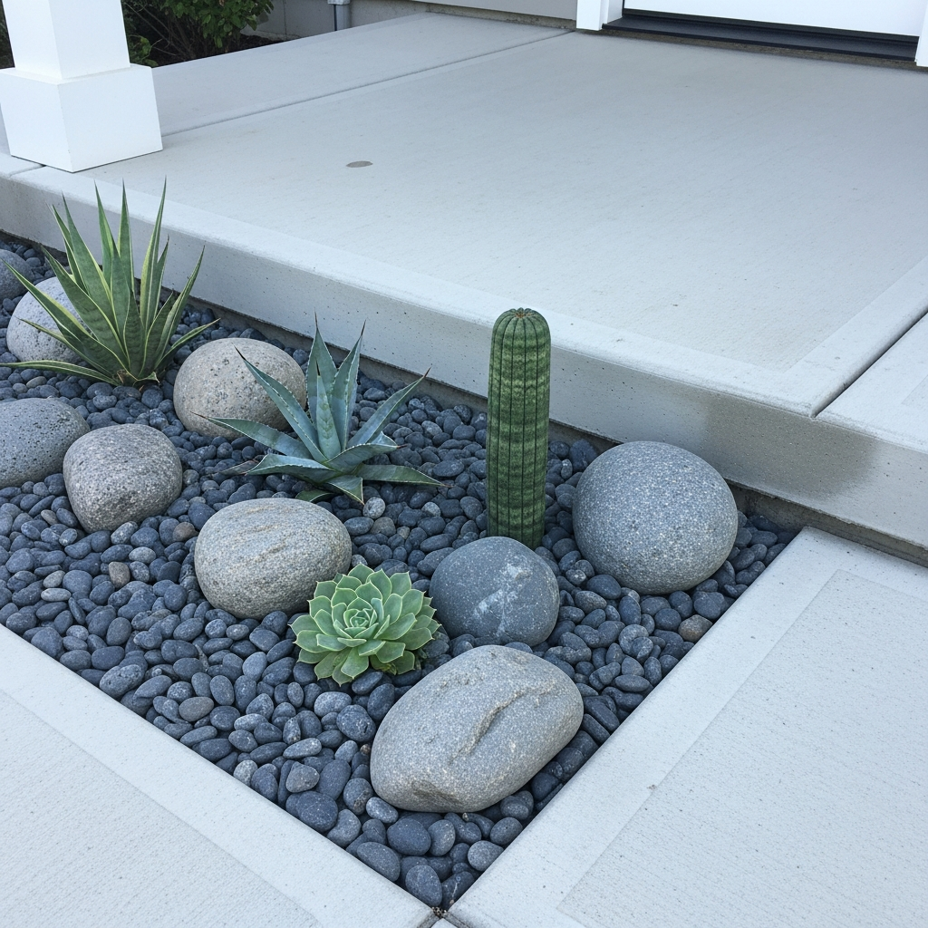 Replace traditional flower beds around the porch with a modern rock garden. Use smooth river stones, white pebbles, or dark basalt rocks to create a clean, maintenance-free landscape. This minimalist approach complements the sharp lines of modern architecture.
