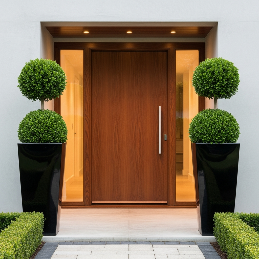 If you prefer movable plants, use tall, tapered planters with structured greenery. Boxwood globes or upright cypress trees in identical pots on either side of the door create a formal yet modern symmetrical look that frames the entrance perfectly.
