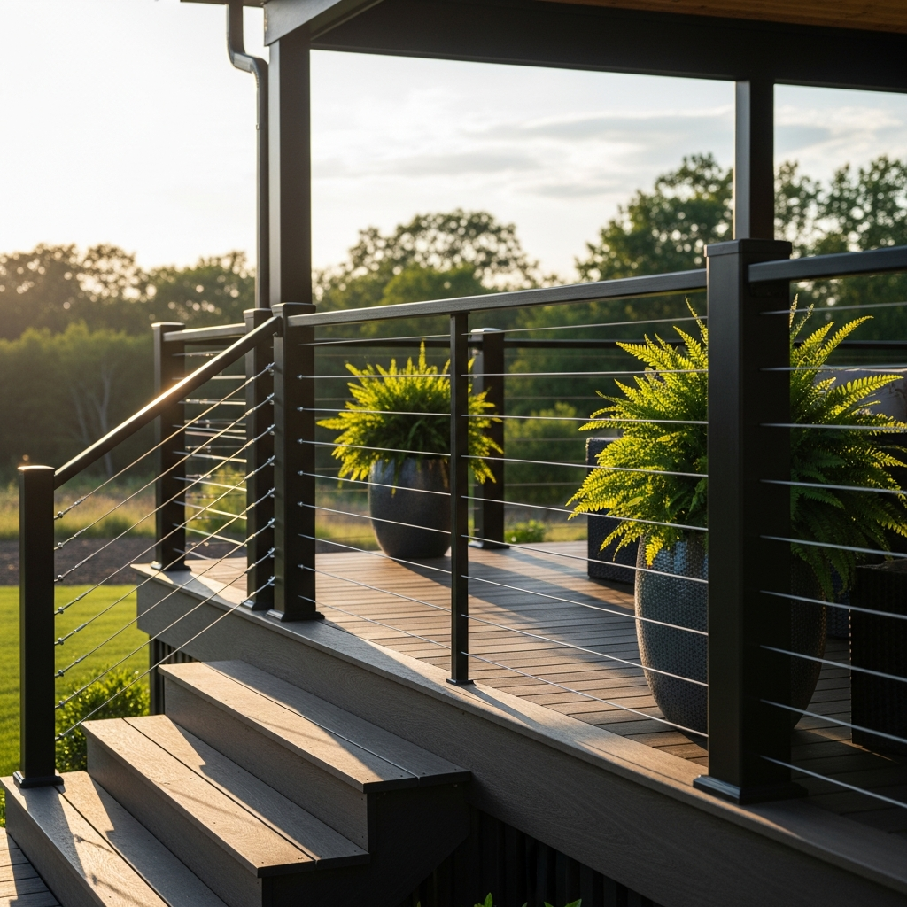 Cable railings offer an industrial aesthetic that is perfect for modern homes. The thin horizontal cables are nearly invisible from a distance, allowing the architecture of the house to shine while providing necessary safety and a rugged, high-tech look.