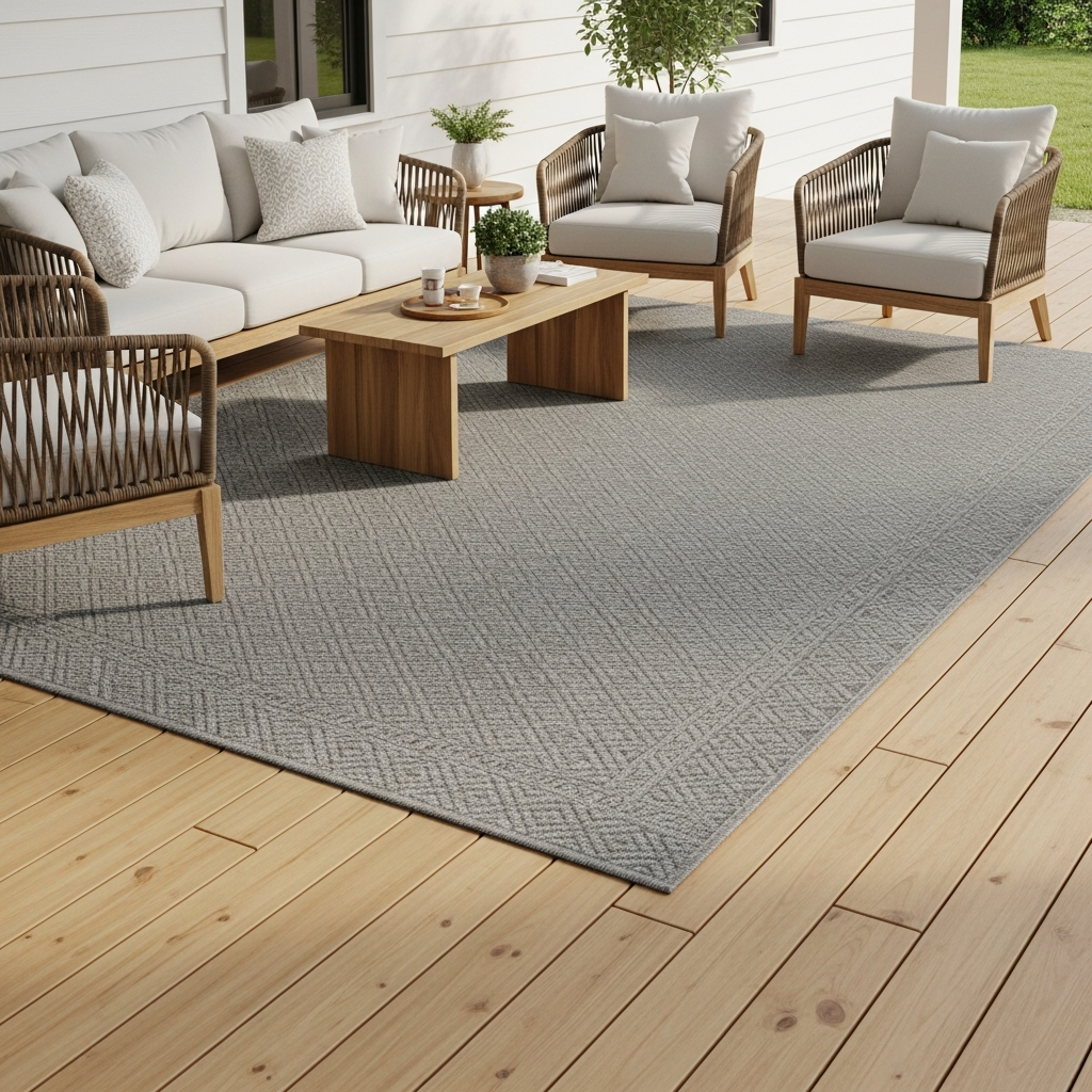 Define the porch space with a modern area rug. Opt for low-pile, all-weather materials in simple patterns like stripes or solid neutral tones. A rug adds warmth and helps transition the porch into a comfortable outdoor living room.