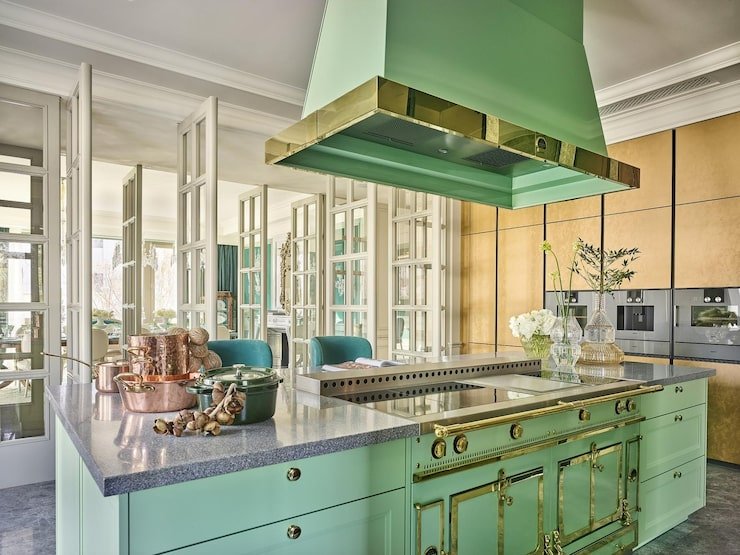 Gold taps, light fixtures, and trims bring instant glamour to any kitchen.