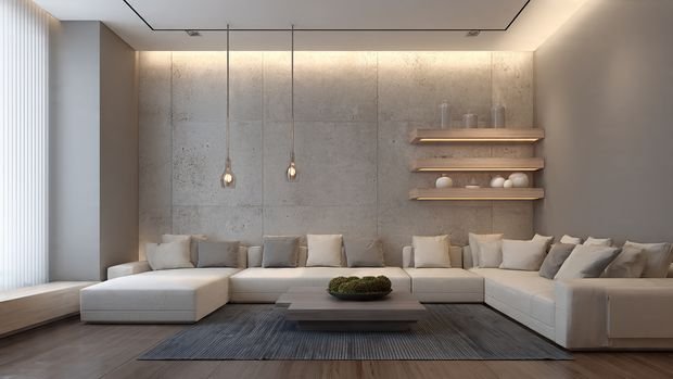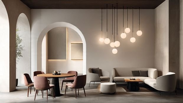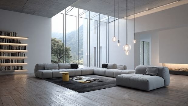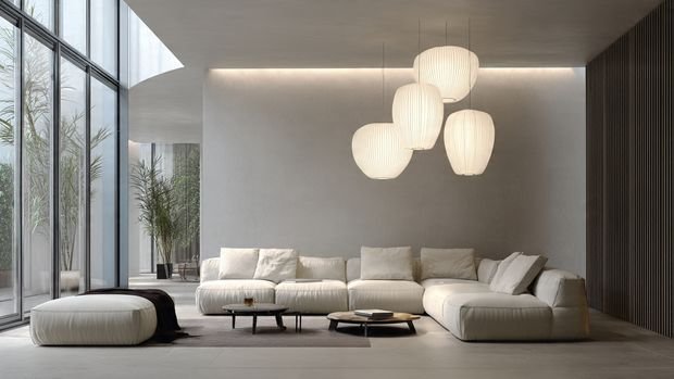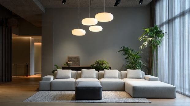 1. Minimalist Pendant Lights + Clean-Line Sofas