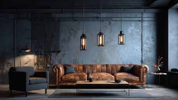 Industrial-style lighting adds boldness and character when matched with rich leather furniture.