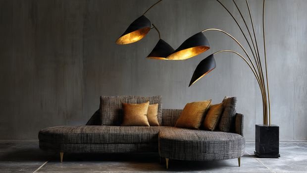 A statement floor lamp beside a deep, comfortable sofa creates a modern lounging area.