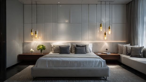 Wall sconces placed on either side of a modern platform bed create a clean, elegant bedroom layout.