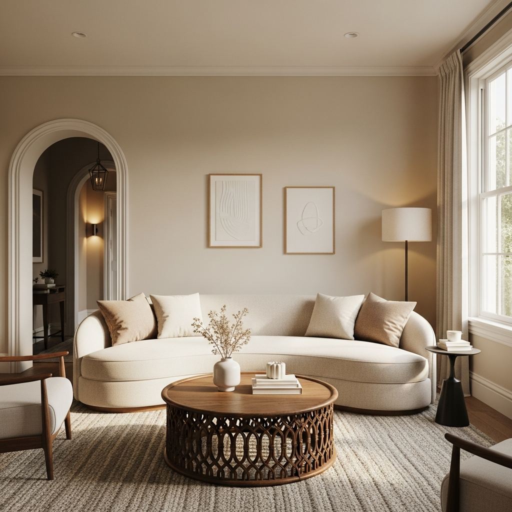 Moving away from rigid, straight lines, the current trend favors soft curves and rounded edges. Circular sofas, arched doorways, and kidney-shaped coffee tables create a sense of flow and comfort, making the living space feel more inviting and less structured.