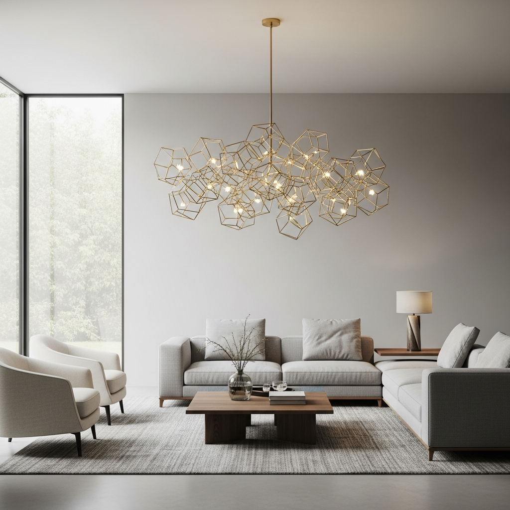 Lighting has moved from a utility to a central design element. Oversized pendants, sculptural chandeliers, and articulated floor lamps act as functional art pieces that define the room’s character and provide adjustable ambiance.