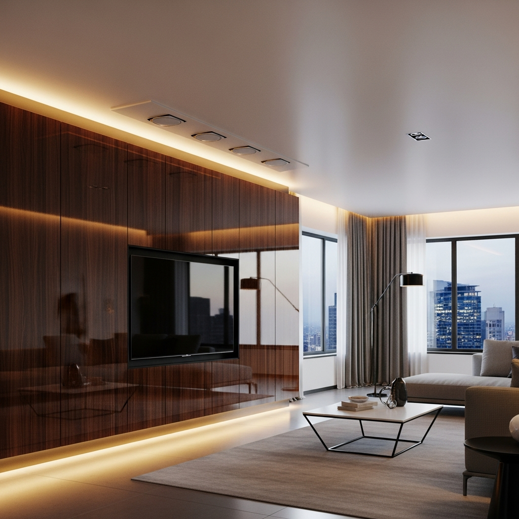 Modern living rooms are becoming smarter, but the technology is becoming invisible. Concealed speakers, automated climate control, and smart glass that tints on demand allow for high-tech living without compromising the room’s aesthetic.