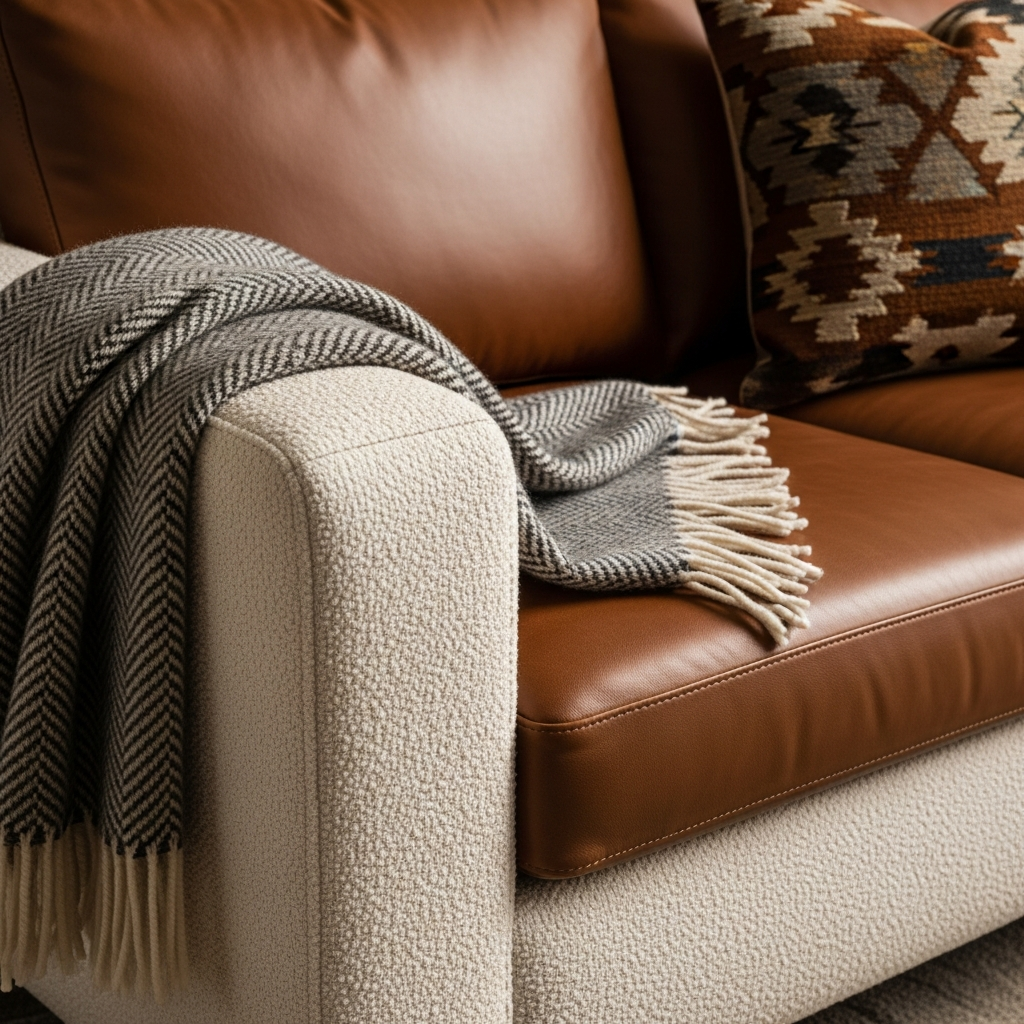 To add depth and visual interest without clutter, designers are layering different textures. Pairing smooth leather with chunky knit throws, silk cushions, and boucle upholstery creates a tactile experience that feels rich and well-considered.